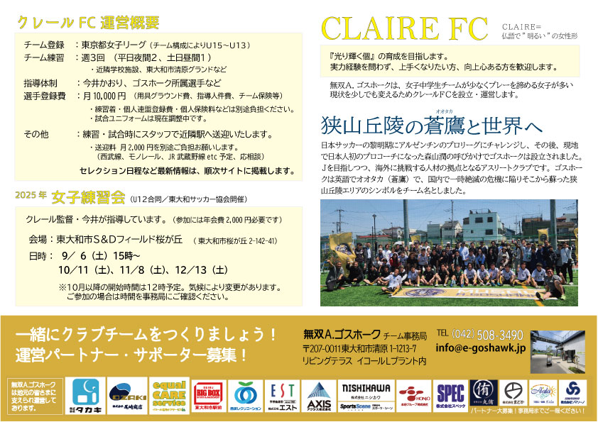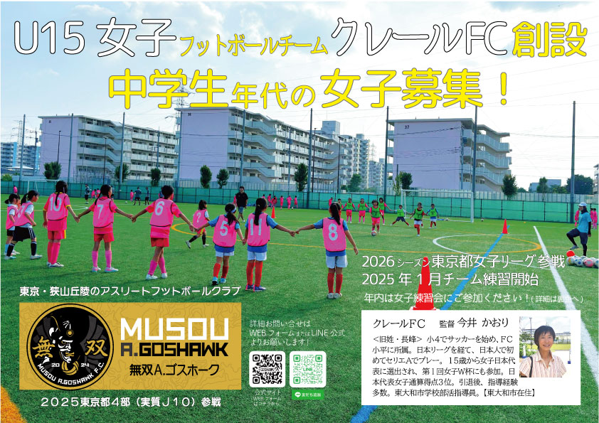 無双A.ゴスホークの姉妹チームとして、U15(中学生年代)の女子チーム「クレールFC」の設立を決定しました。2026年シーズンの東京都リーグへの参入に向け、鋭意準備してまいります。