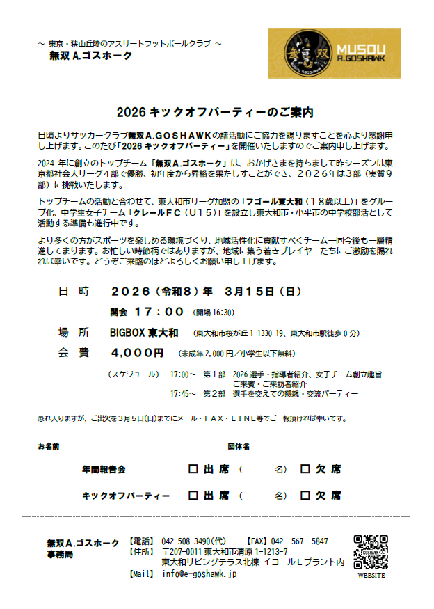 2026キックオフパーティ案内|無双Aゴスホーク|東京狭山丘陵のアスリートフットボールクラブ