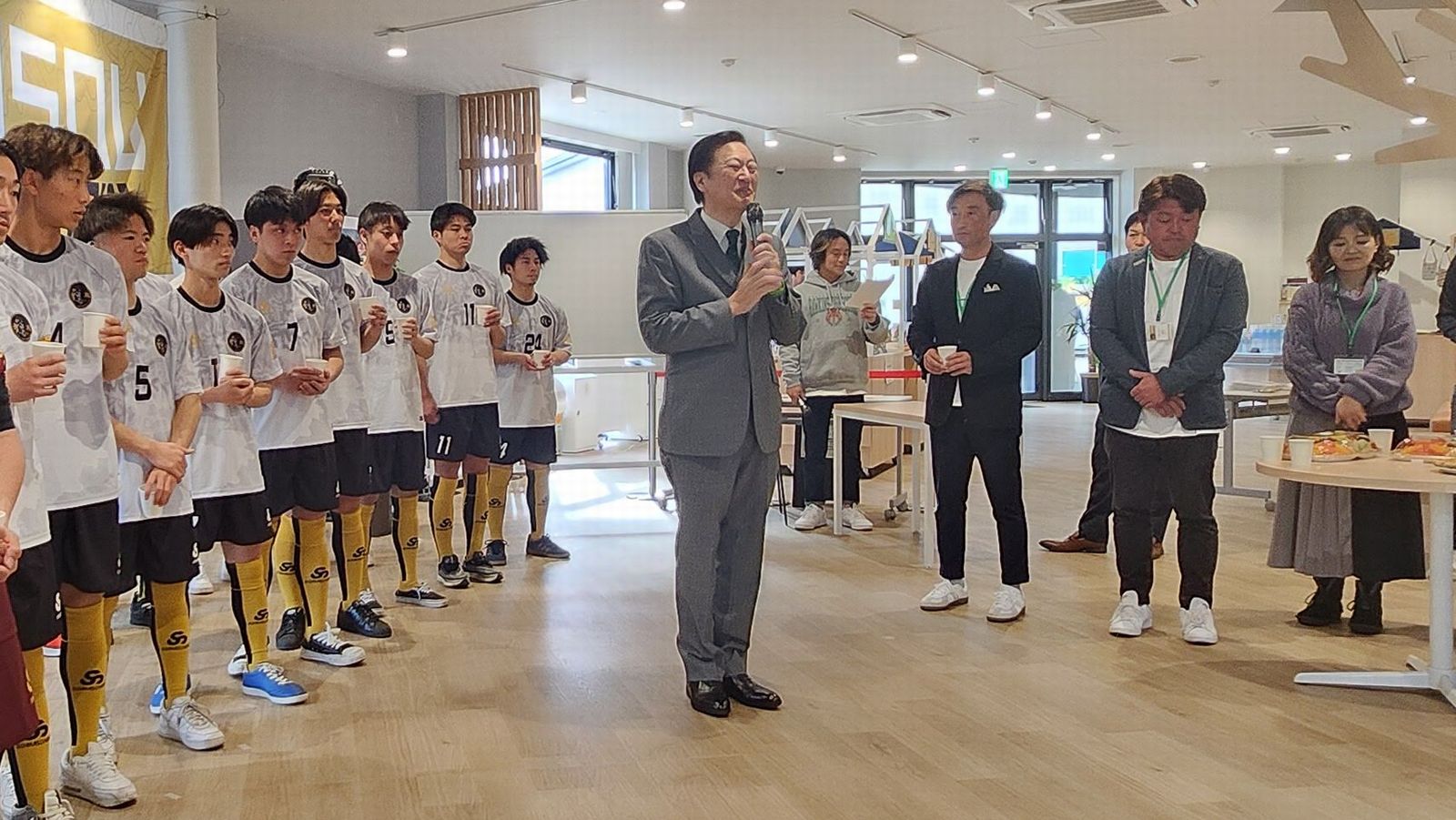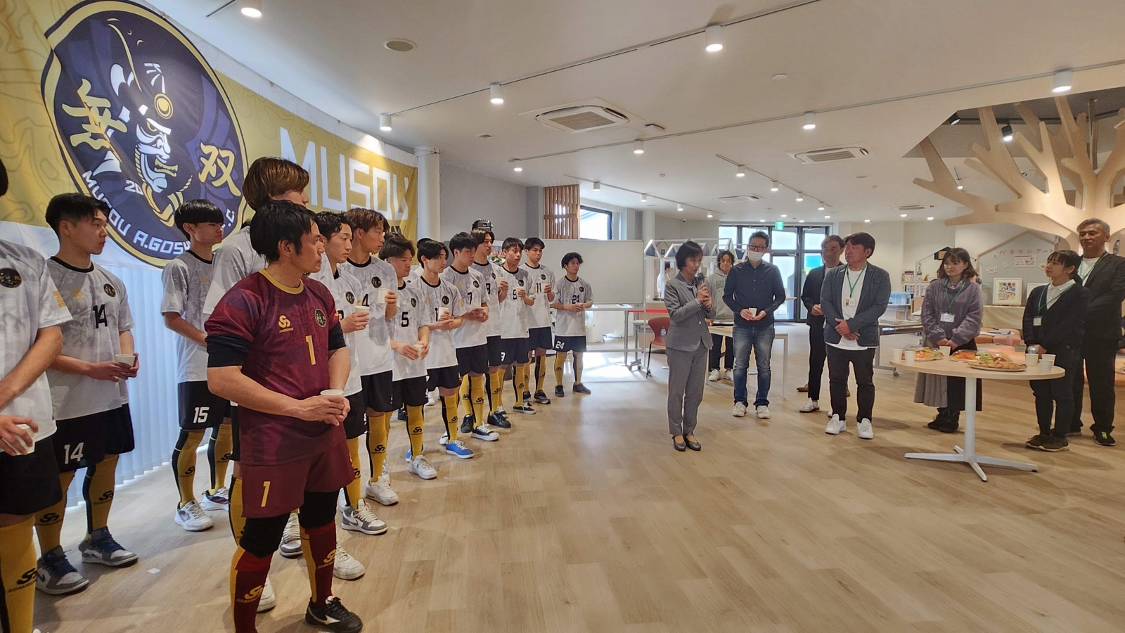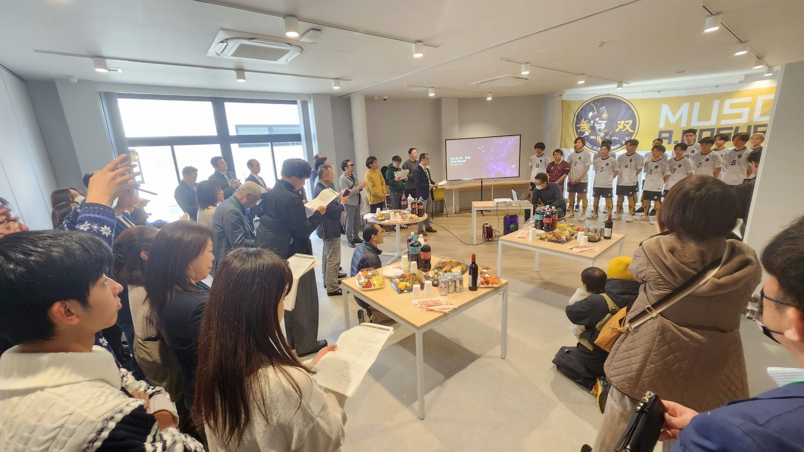 キックオフパーティの会場は東大和リビングテラス内「みんなの部屋」。前半でご挨拶・選手披露・ご来賓/パートナーご紹介、乾杯してからの後半で懇親となりました。