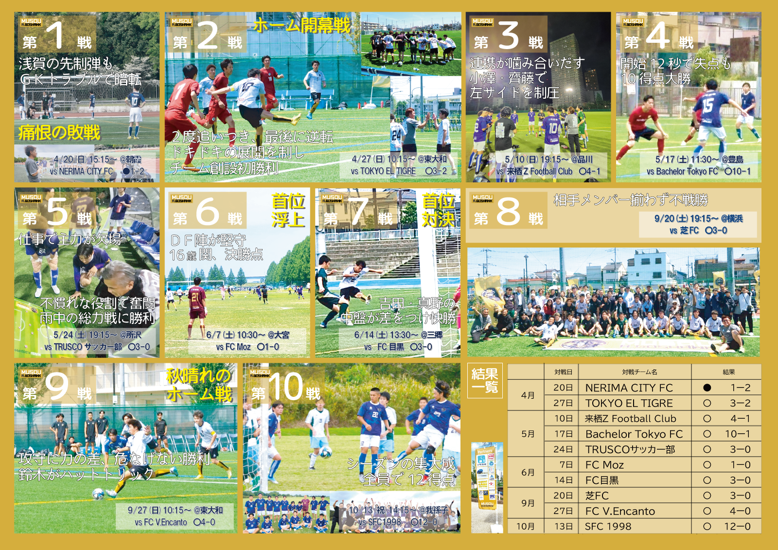 | 2025 | 【リーグ戦】東京都社会人サッカーリーグ4部5ブロック 優勝( 10試合9勝1敗)3部昇格 【カップ戦】東京カップ出場 |